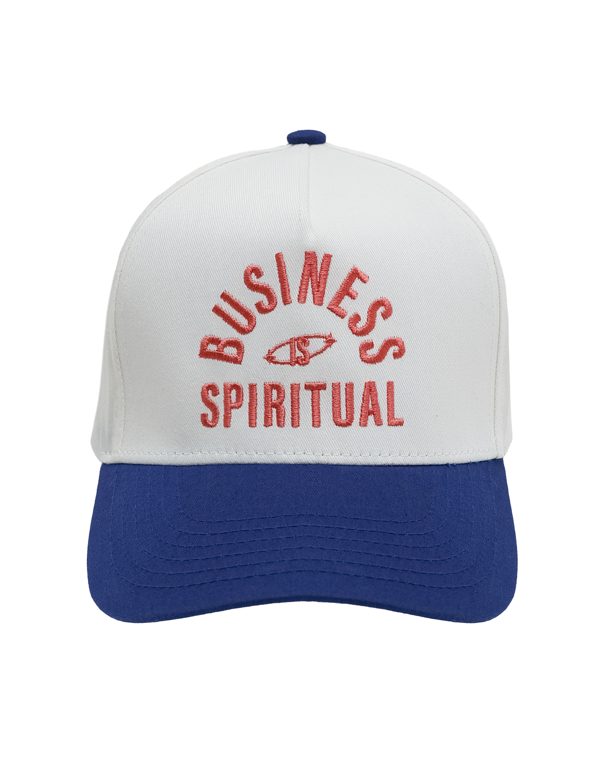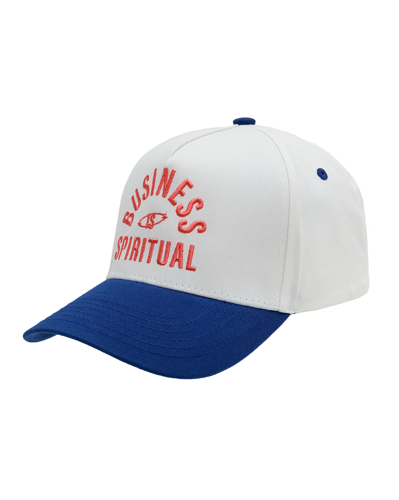 Five-panel, two tone snapback cap with contrasting visor, top button and sewn eyelets with Hot Coral stitching "Business is Spiritual"